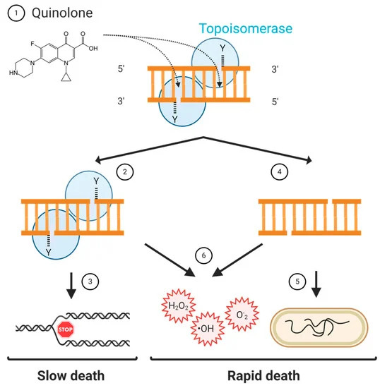Figura 2. Modelo de letalidad de quinolonas. Las quinolonas estabilizan el complejo de escisión topoisomerasa-ADN en el que se produce una rotura de doble cadena. (2) Si el complejo de escisión no se resuelve, (3) la replicación y la transcripción no pueden ocurrir, lo que causa una muerte lenta de las células bacterianas. (4) Si se elimina la topoisomerasa, la rotura de la doble cadena queda libre y, si no se repara, (5) conduce a la fragmentación del cromosoma, lo que provoca una rápida muerte de las células bacterianas. (6) El complejo de escisión estabilizado, o la eliminación de la topoisomerasa del complejo de escisión, puede dar lugar a la acumulación de especies reactivas de oxígeno (ROS) que pueden causar una rápida muerte celular bacteriana.